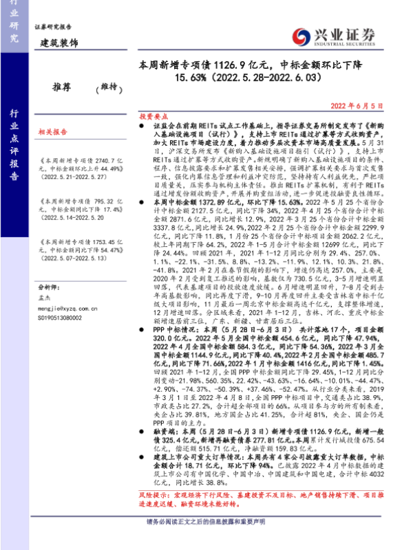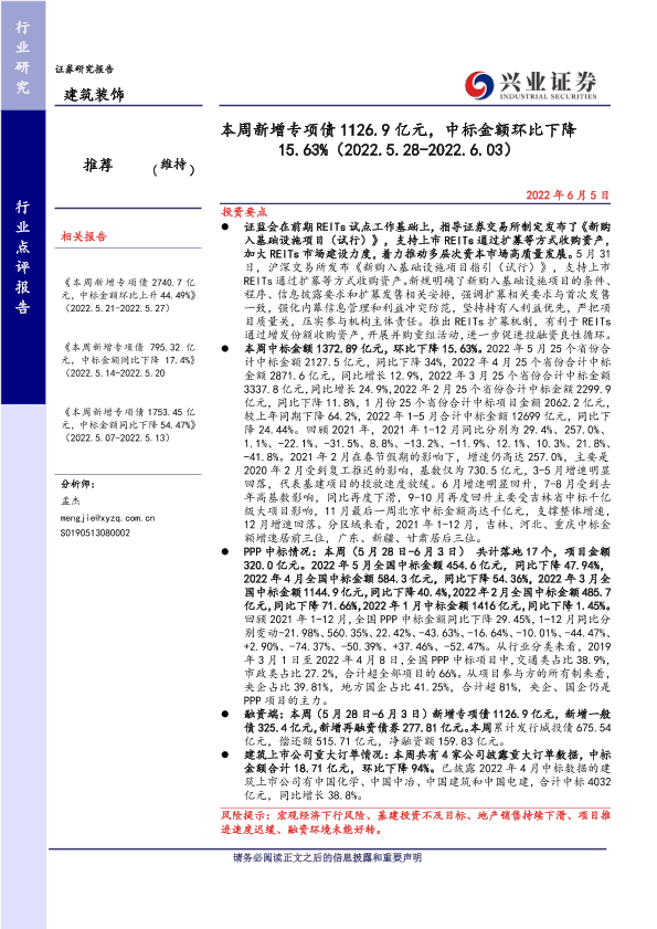 【兴业证券】【20220605】本周新增专项债1126.9亿元,中标金额环比下降15.63%-40页