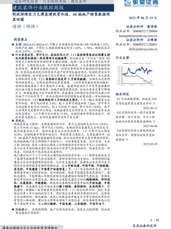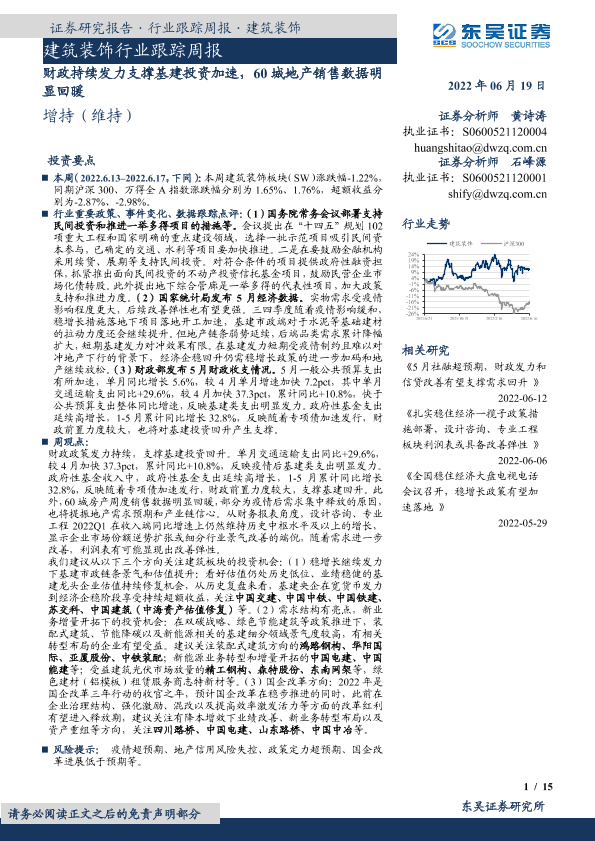 【东吴证券】【20220619】建筑装饰行业跟踪周报:财政持续发力支撑基建投资加速,60城地产销售数据明显回暖-15页