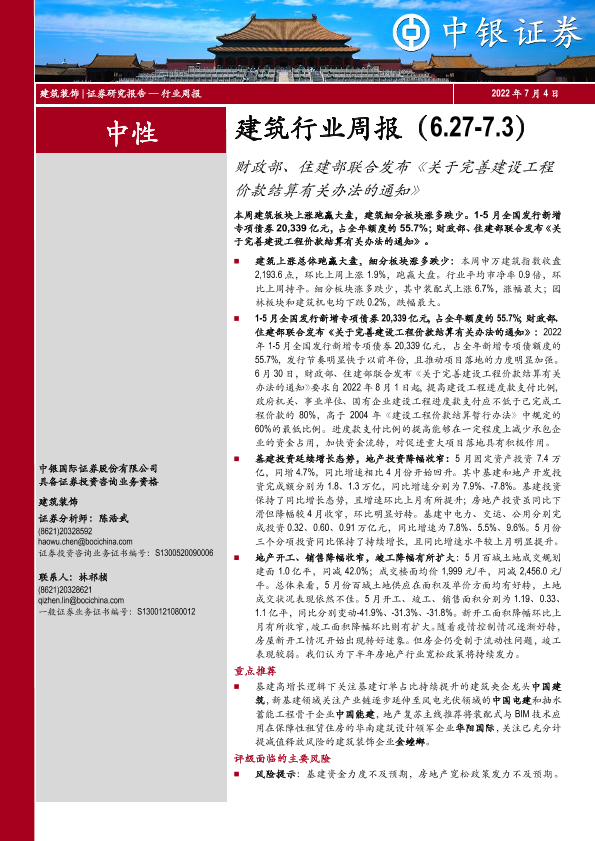 【中银证券】【20220704】建筑行业周报:财政部、住建部联合发布《关于完善建设工程价款结算有关办法的通知》-15页
