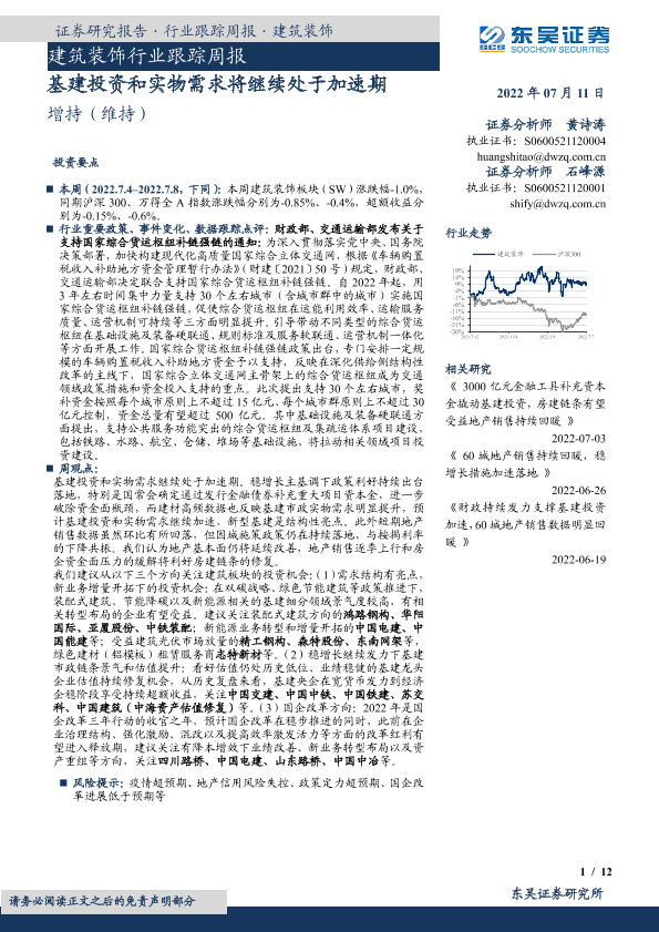 【东吴证券】【20220711】建筑装饰行业跟踪周报:基建投资和实物需求将继续处于加速期-12页