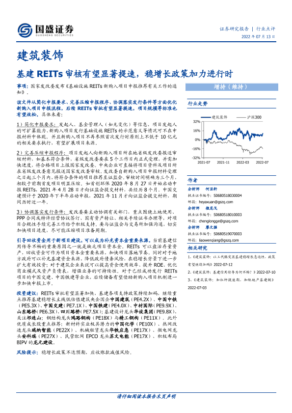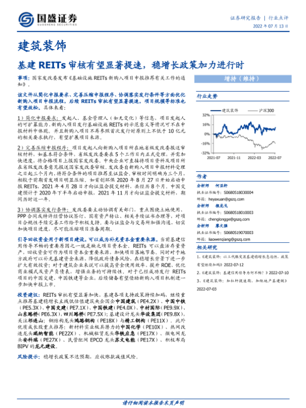 【国盛证券】【20220713】建筑装饰行业点评:基建REITs审核有望显著提速,稳增长政策加力进行时-3页