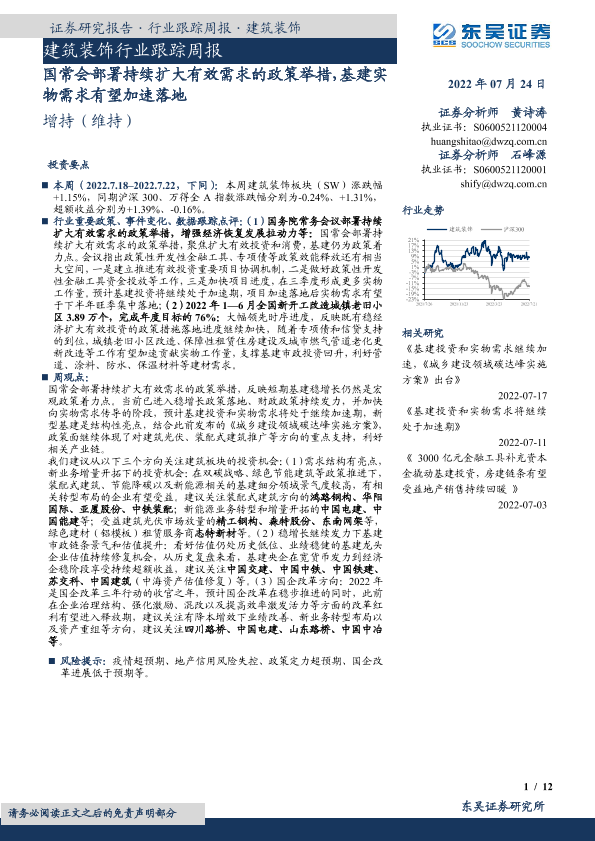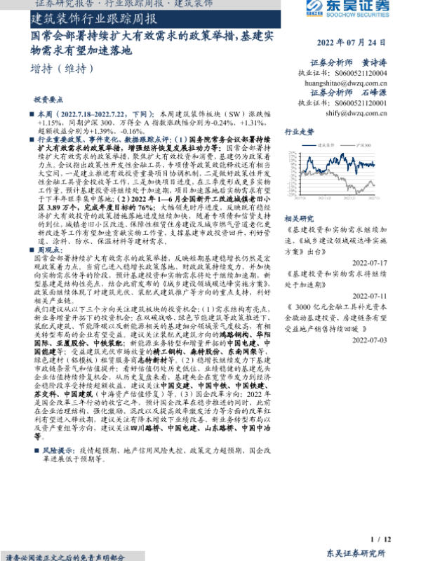 【东吴证券】【20220724】建筑装饰行业跟踪周报:国常会部署持续扩大有效需求的政策举措,基建实物需求有望加速落地-12页
