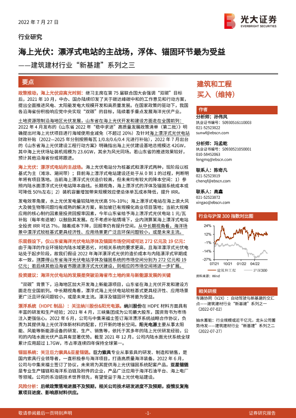 【光大证券】【20220727】建筑建材行业“新基建”系列之三:海上光伏:漂浮式电站的主战场,浮体、锚固环节最为受益-22页