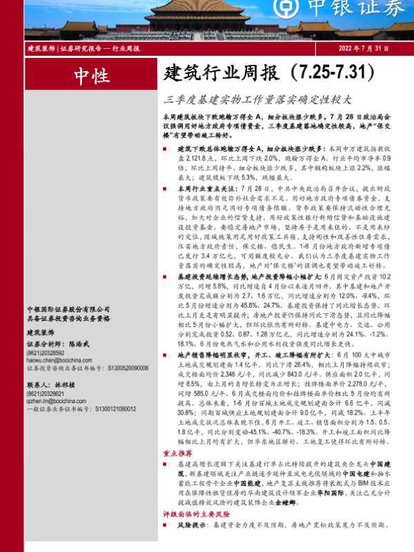 【中银证券】【20220731】建筑行业周报:三季度基建实物工作量落实确定性较大-14页