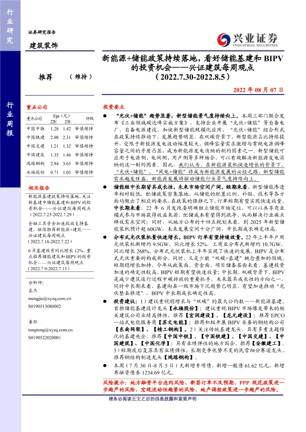 【兴业证券】【20220807】兴证建筑每周观点:新能源+储能政策持续落地,看好储能基建和BIPV的投资机会-40页