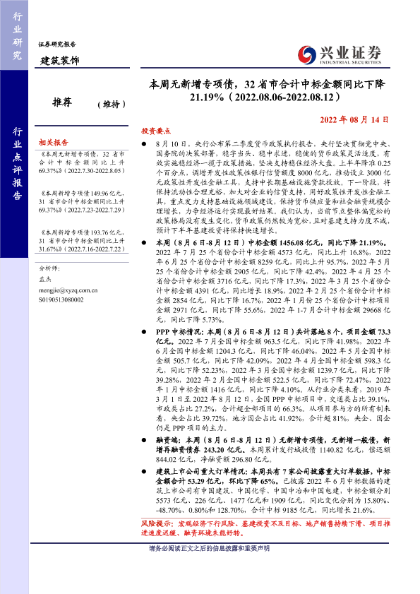 【兴业证券】【20220814】本周无新增专项债,32省市合计中标金额同比下降21.19%-37页