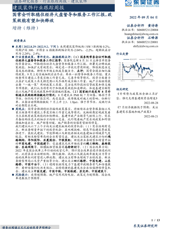 【东吴证券】【20220904】建筑装饰行业跟踪周报:国常会听取稳住经济大盘督导和服务工作汇报,政策效能有望加快释放-13页