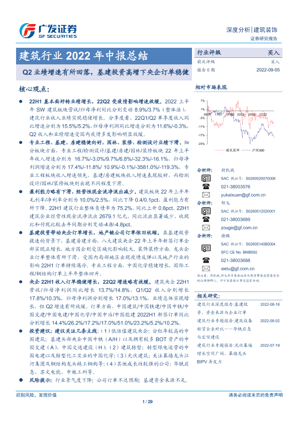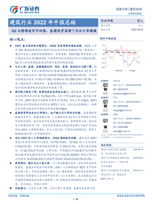 【广发证券】【20220905】建筑行业2022年中报总结:Q2业绩增速有所回落,基建投资高增下央企订单稳健-29页
