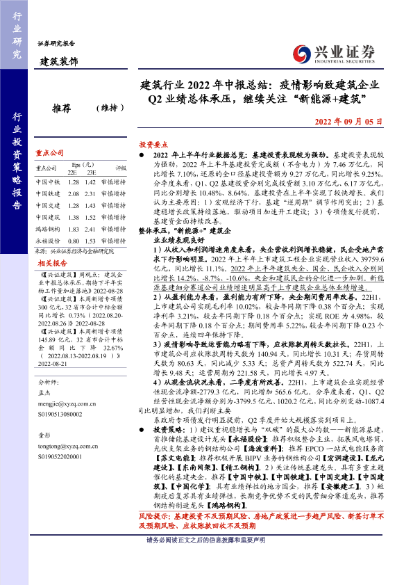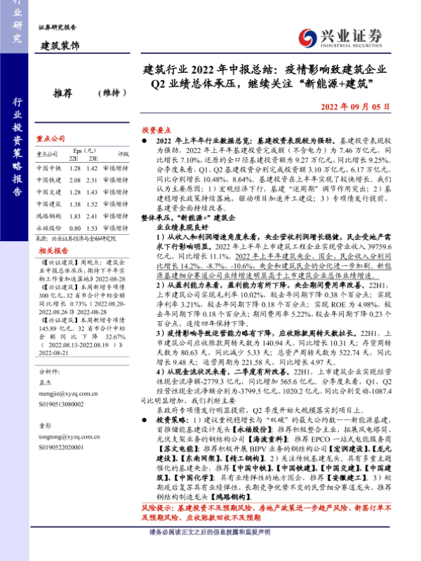 【兴业证券】【20220905】建筑行业2022年中报总结:疫情影响致建筑企业Q2业绩总体承压,继续关注“新能源+建筑”-25页