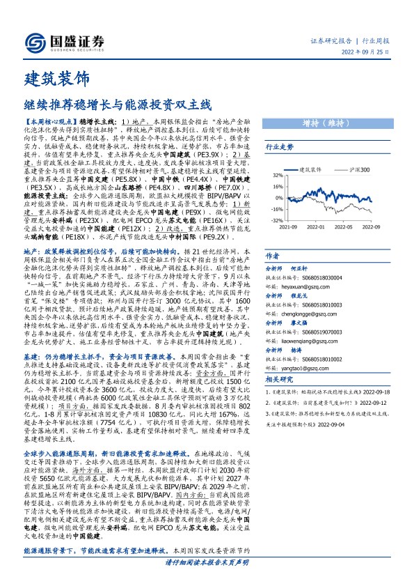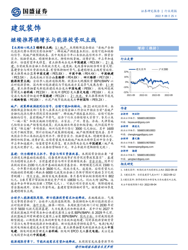【国盛证券】【20220925】建筑装饰行业周报:继续推荐稳增长与能源投资双主线-10页