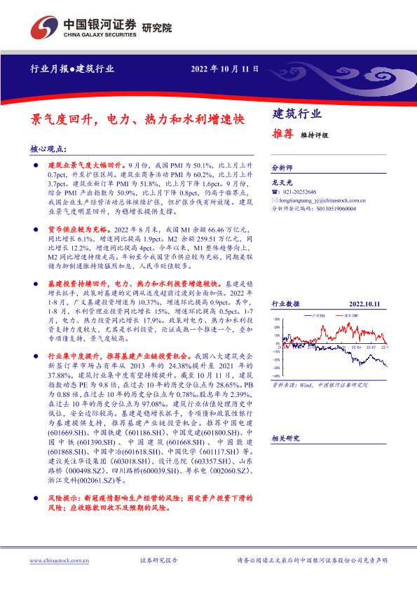 【银河证券】【20221011】建筑行业月报:景气度回升,电力、热力和水利增速快-14页