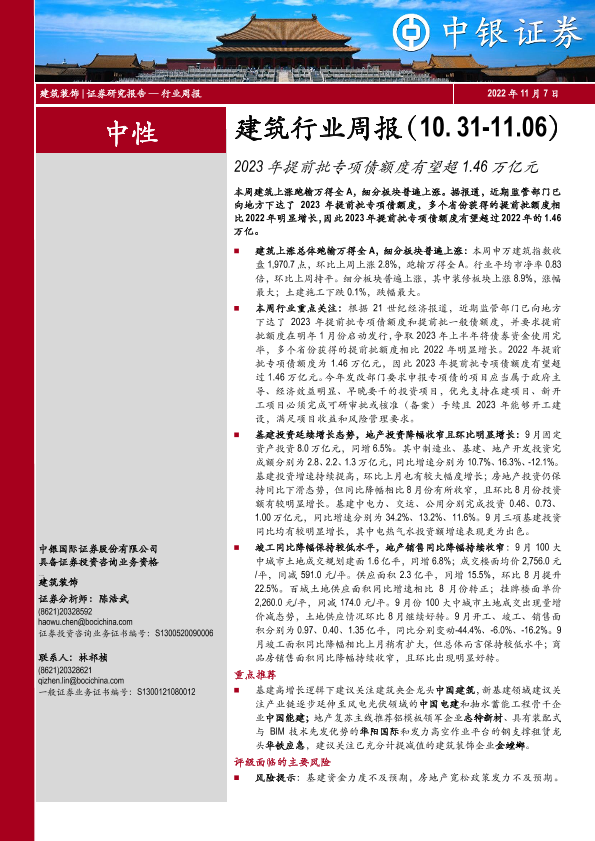 【中银证券】【20221107】建筑行业周报:2023年提前批专项债额度有望超1.46万亿元-15页