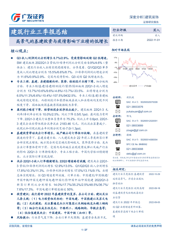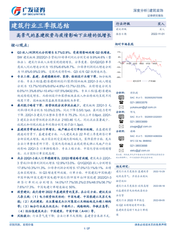 【广发证券】【20221101】建筑行业三季报总结:高景气的基建投资与疫情影响下业绩的低增长-27页