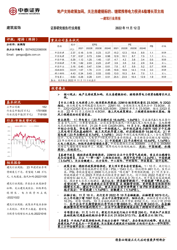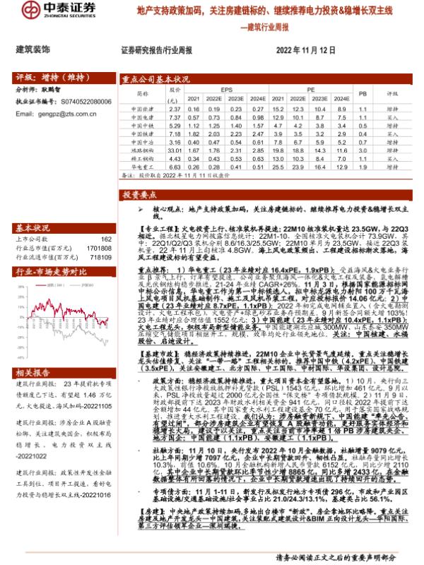 【中泰证券】【20221112】建筑行业周报:地产支持政策加码,关注房建链标的、继续推荐电力投资&稳增长双主线-25页