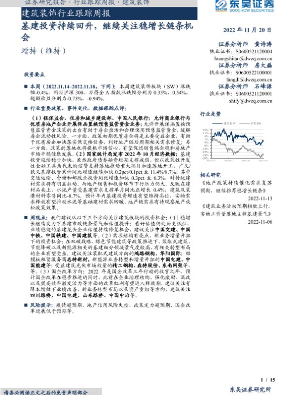 【东吴证券】【20221120】建筑装饰行业跟踪周报:基建投资持续回升,继续关注稳增长链条机会-15页