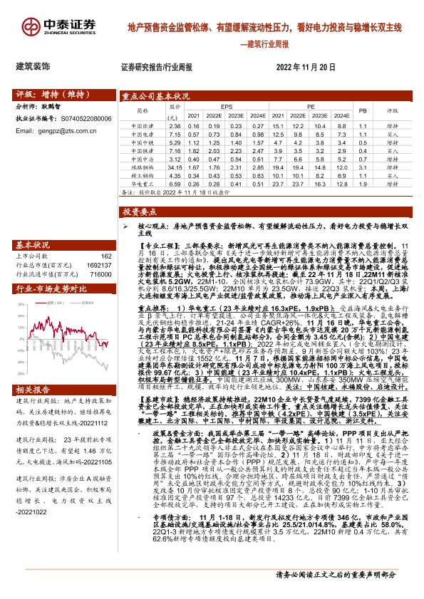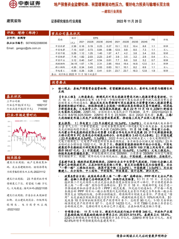 【中泰证券】【20221120】建筑行业周报:地产预售资金监管松绑、有望缓解流动性压力,看好电力投资与稳增长双主线-23页