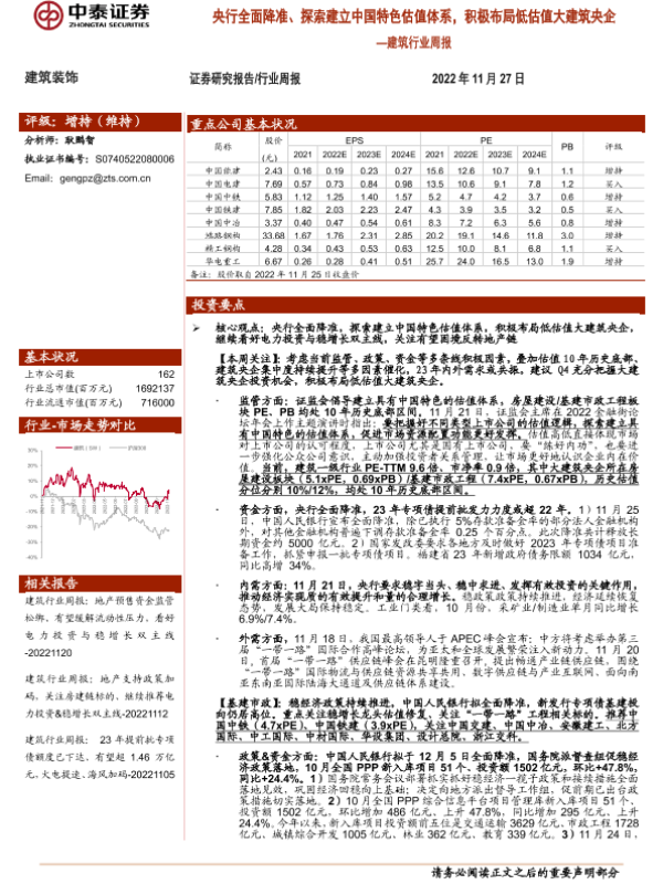 【中泰证券】【20221127】建筑行业周报:央行全面降准、探索建立中国特色估值体系,积极布局低估值大建筑央企-24页