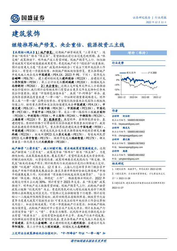 【国盛证券】【20221211】建筑装饰行业周报:继续推荐地产修复、央企重估、能源投资三主线-14页