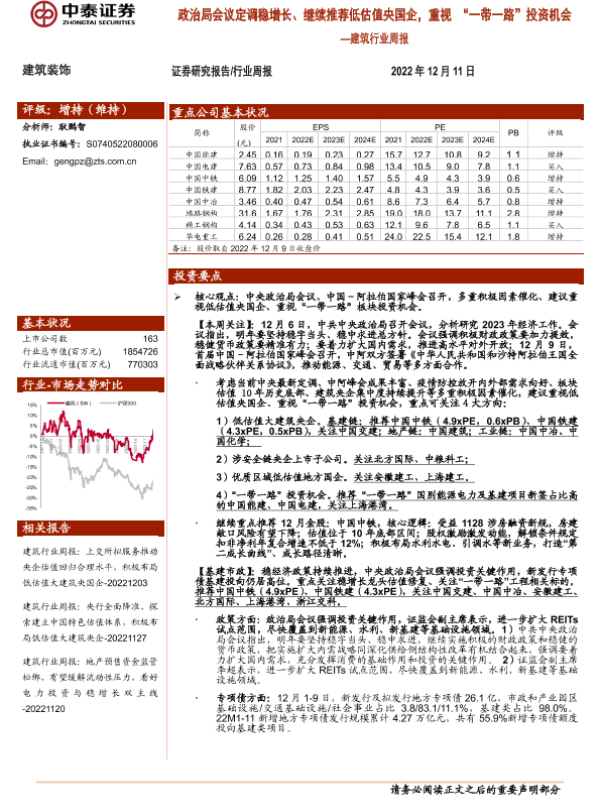 【中泰证券】【20221211】建筑行业周报:政治局会议定调稳增长、继续推荐低估值央国企,重视“一带一路”投资机会-25页