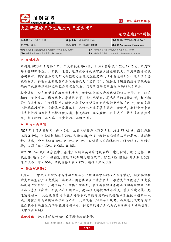 【川财证券】【20230106】电力基建行业周报:央企新能源产业发展成为“重头戏”-12页
