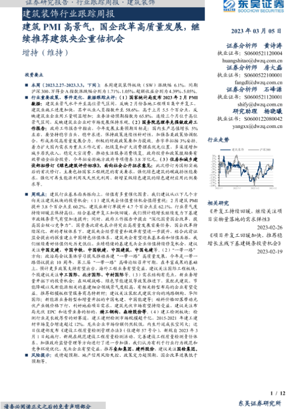 【东吴证券】【20230305】建筑装饰行业跟踪周报:建筑PMI高景气,国企改革高质量发展,继续推荐建筑央企重估机会-12页