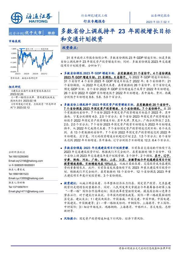 【海通证券】【20230302】建筑工程行业专题报告:多数省份上调或持平 23年固投增长目标和交通计划投资-12页