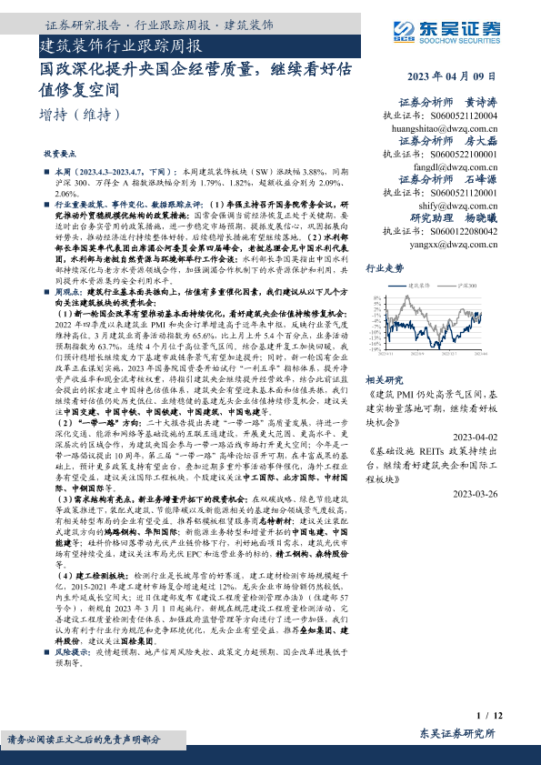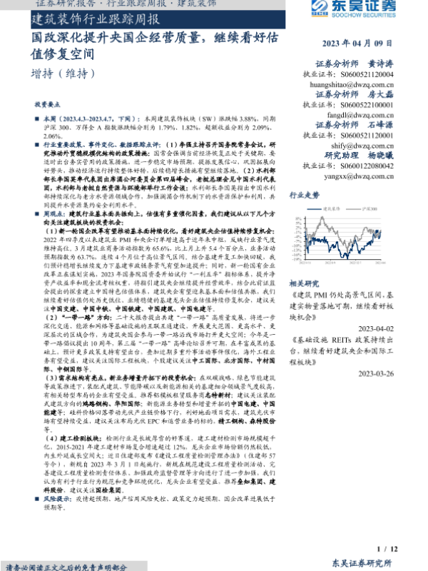 【东吴证券】【20230409】建筑装饰行业跟踪周报:国改深化提升央国企经营质量,继续看好估值修复空间-12页