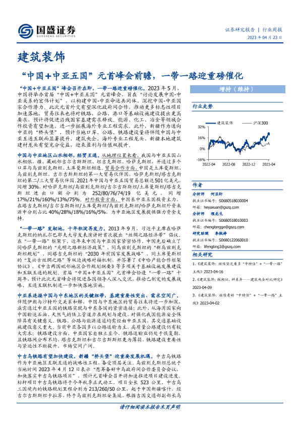 【国盛证券】【20230423】建筑装饰行业周报:“中国+中亚五国”元首峰会前瞻,一带一路迎重磅催化-13页
