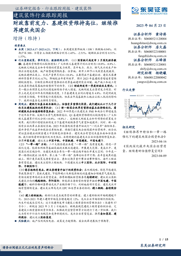 【东吴证券】【20230423】建筑装饰行业跟踪周报:财政靠前发力、基建投资维持高位,继续推荐建筑央国企-15页
