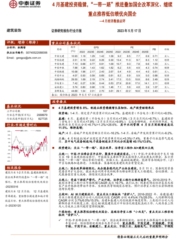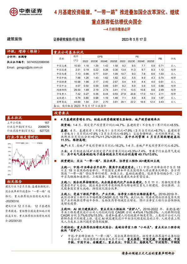 【中泰证券】【20230517】4月经济数据点评:4月基建投资稳健,“一带一路”推进叠加国企改革深化、继续重点推荐低估绩优央国企-23页