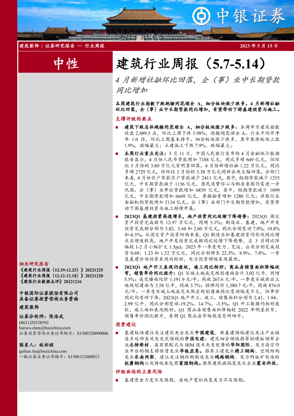 【中银证券】【20230515】4月新增社融环比回落,企(事)业中长期贷款同比增加-14页