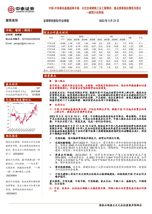 【中泰证券】【20230521】中国-中亚峰会基建成果丰硕、关注全球钢铁工业工程需求,重点推荐低估绩优央国企-34页