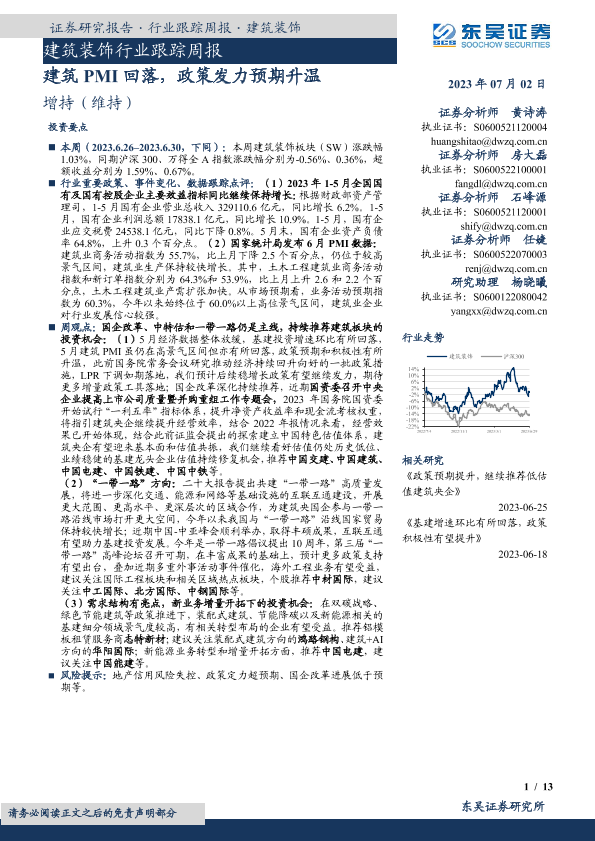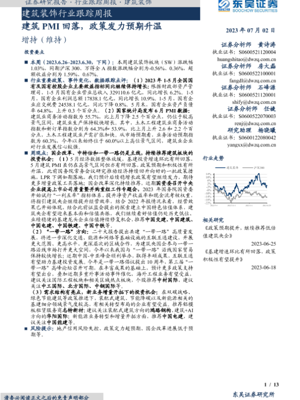 【东吴证券】【20230702】建筑装饰行业跟踪周报:建筑PMI回落,政策发力预期升温-13页