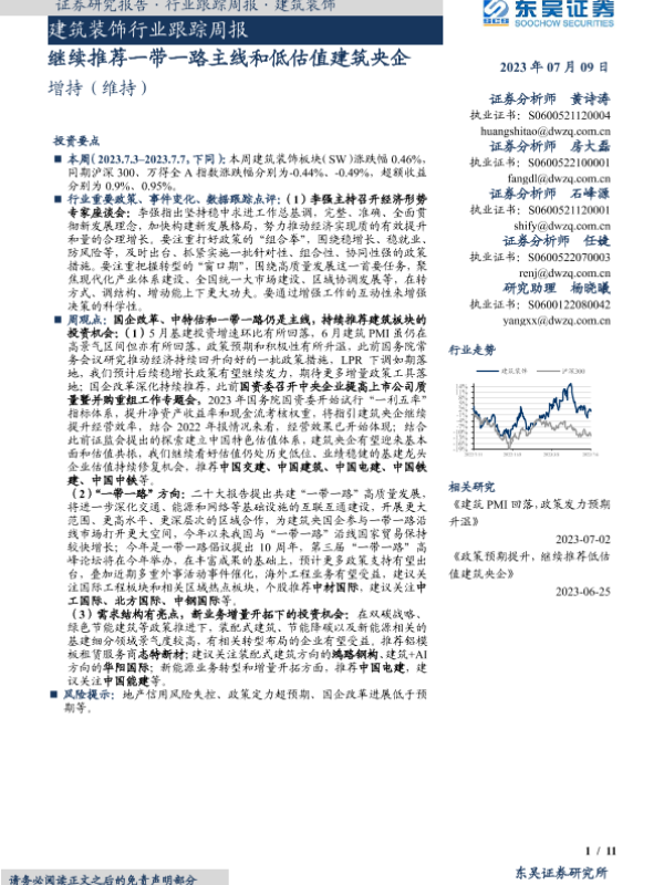 【东吴证券】【20230709】建筑装饰行业跟踪周报:继续推荐一带一路主线和低估值建筑央企-11页
