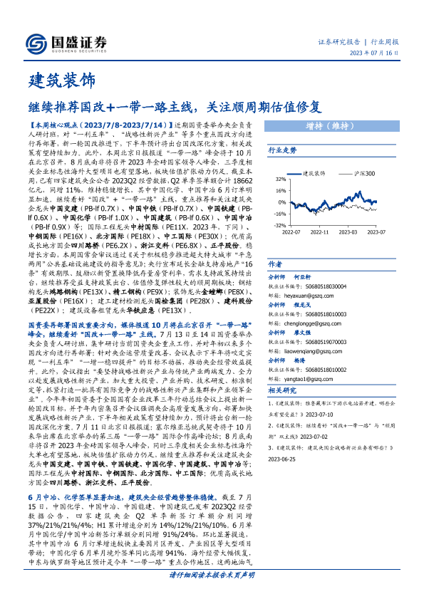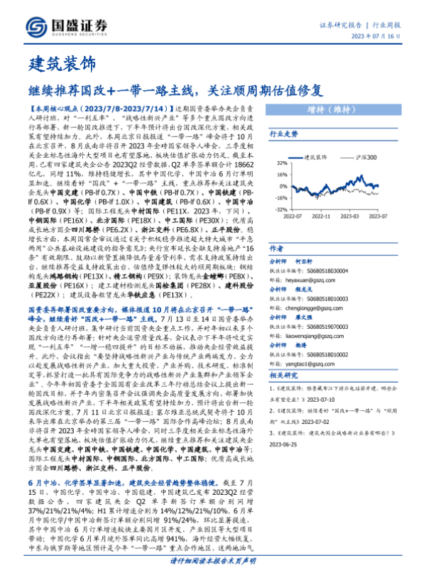 【国盛证券】【20230716】建筑装饰行业周报:继续推荐国改+一带一路主线,关注顺周期估值修复-11页