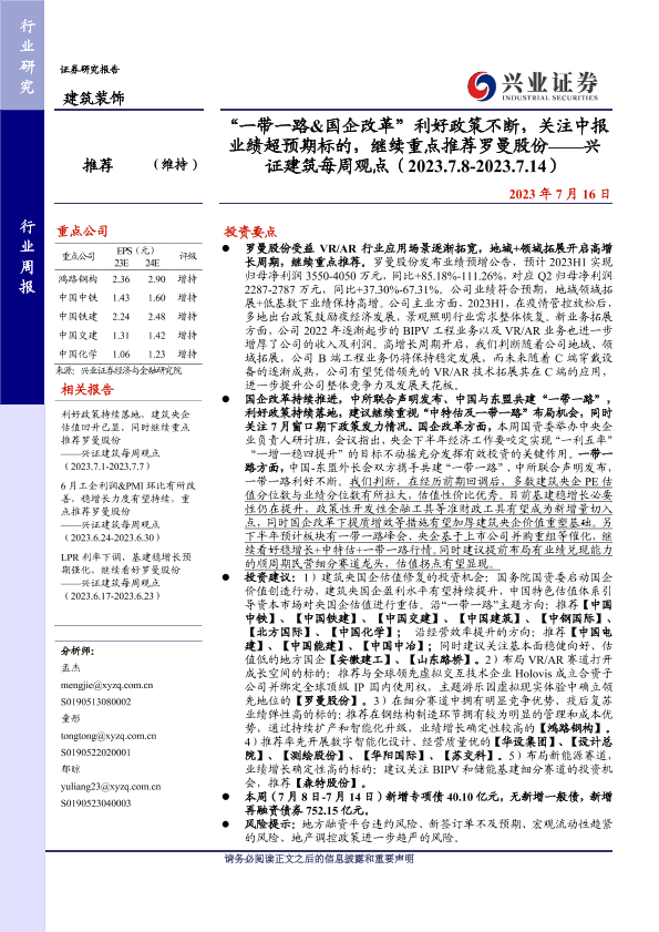 【兴业证券】【20230716】‘一带一路&国企改革’利好政策不断,关注中报业绩超预期标的,继续重点推荐罗曼股份-32页