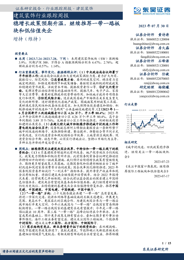 【东吴证券】【20230730】建筑装饰行业跟踪周报:稳增长政策预期升温,继续推荐一带一路板块和低估值央企-15页