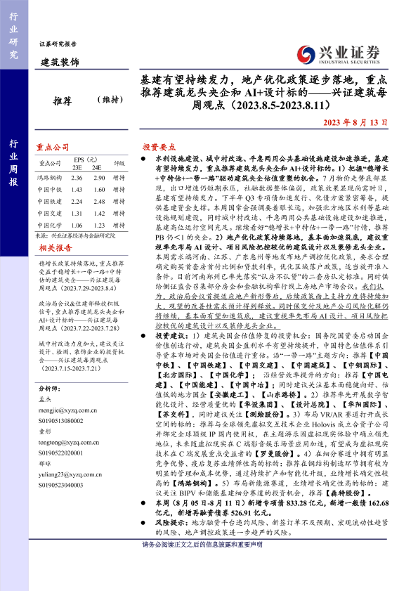 【兴业证券】【20230813】兴证建筑每周观点:基建有望持续发力,地产优化政策逐步落地-32页
