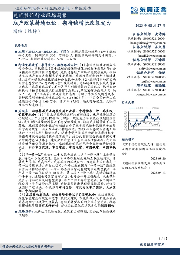 【东吴证券】【20230827】建筑装饰行业跟踪周报:地产政策持续放松,期待稳增长政策发力-12页
