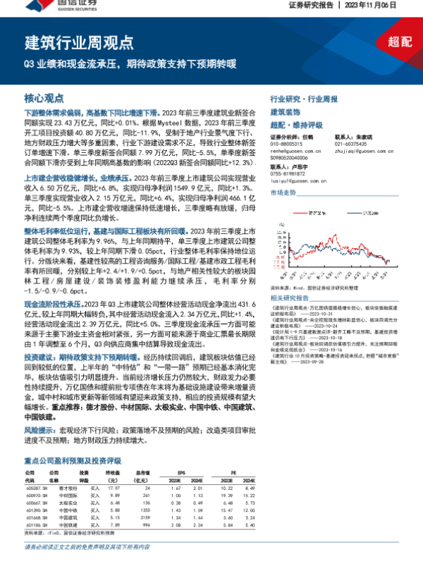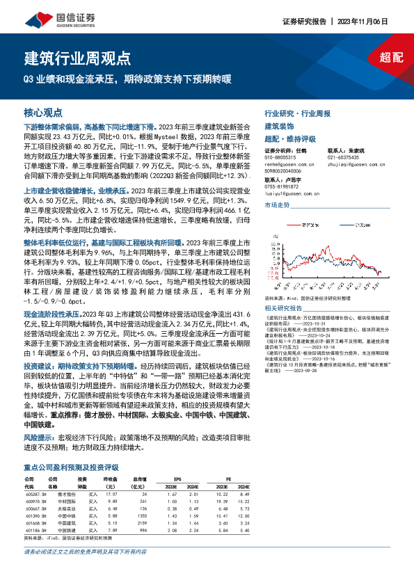 【国信证券】【20231106】建筑行业周观点:Q3业绩和现金流承压,期待政策支持下预期转暖-11页