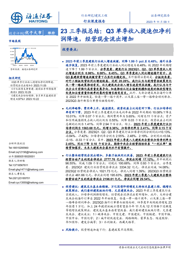 三季报总结 净利润降速 建筑工程 收入提速 经营现金流