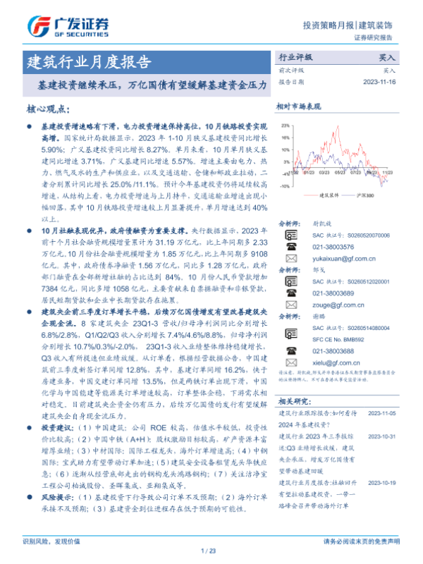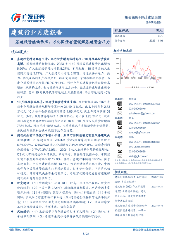 【广发证券】【20231116】建筑行业月度报告:基建投资继续承压,万亿国债有望缓解基建资金压力-23页
