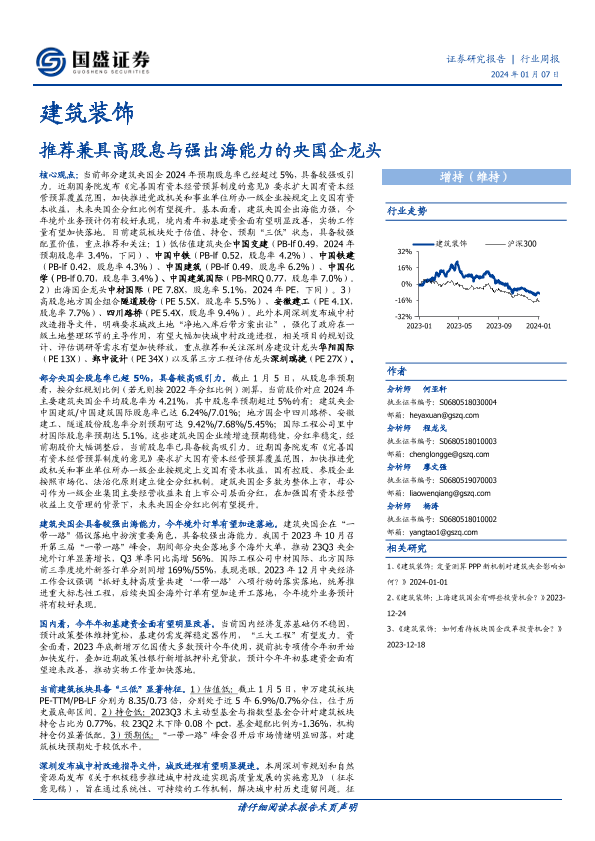 【国盛证券】【20240107】建筑装饰行业周报:推荐兼具高股息与强出海能力的央国企龙头-10页