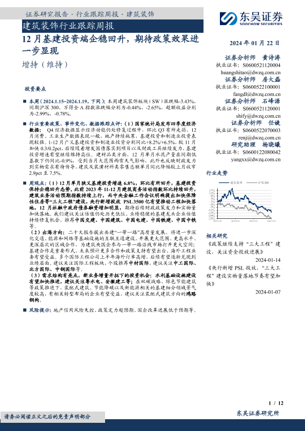 【东吴证券】【20240122】建筑装饰行业跟踪周报:12月基建投资端企稳回升,期待政策效果进一步显现-12页