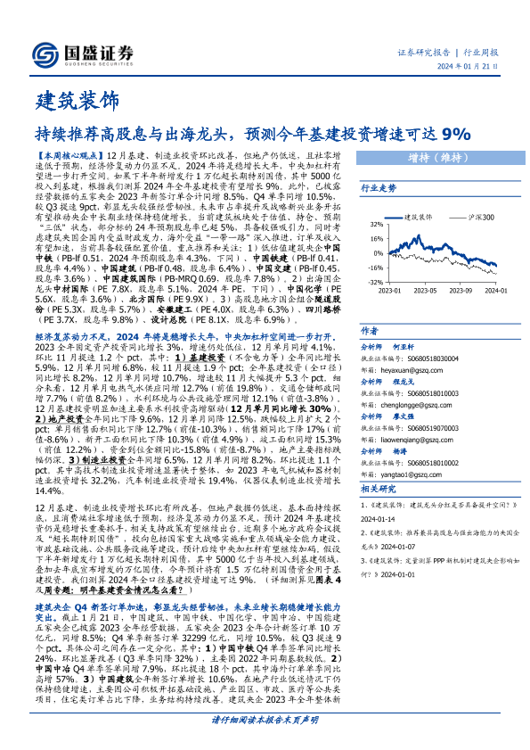 【国盛证券】【20240121】建筑装饰行业周报:持续推荐高股息与出海龙头,预测今年基建投资增速可达9%-14页