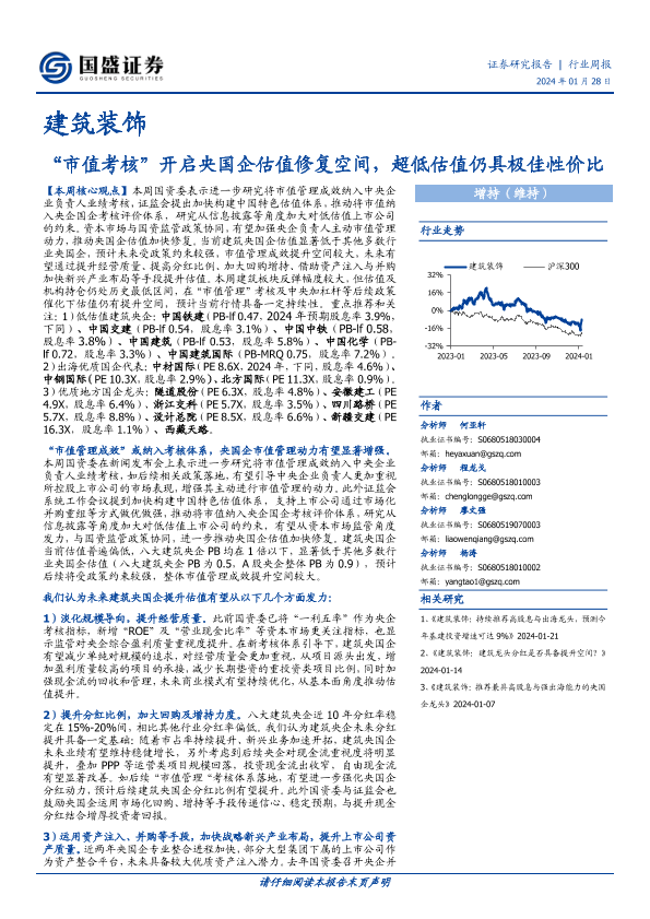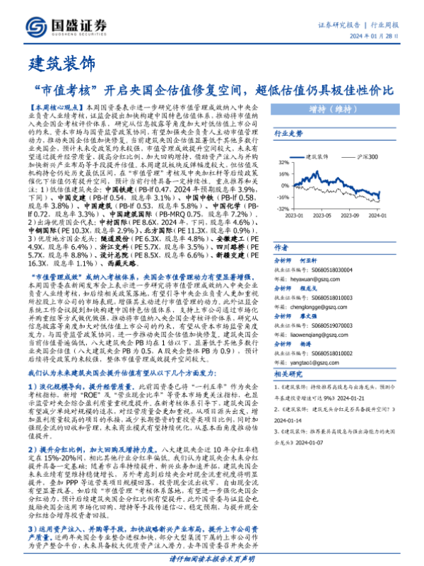 【国盛证券】【20240128】建筑装饰行业周报:“市值考核”开启央国企估值修复空间,超低估值仍具极佳性价比-12页