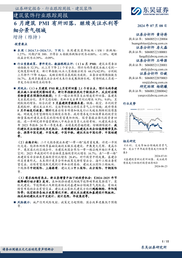【东吴证券】【20240708】建筑装饰行业跟踪周报:6月建筑PMI有所回落,继续关注水利等细分景气领域-11页