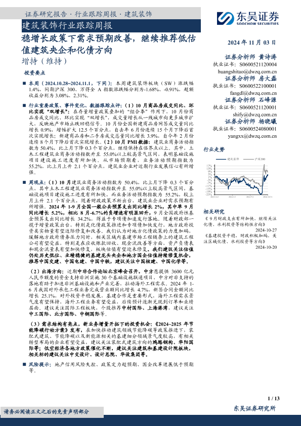 【东吴证券】【20241103】建筑装饰行业跟踪周报:稳增长政策下需求预期改善,继续推荐低估值建筑央企和化债方向-13页