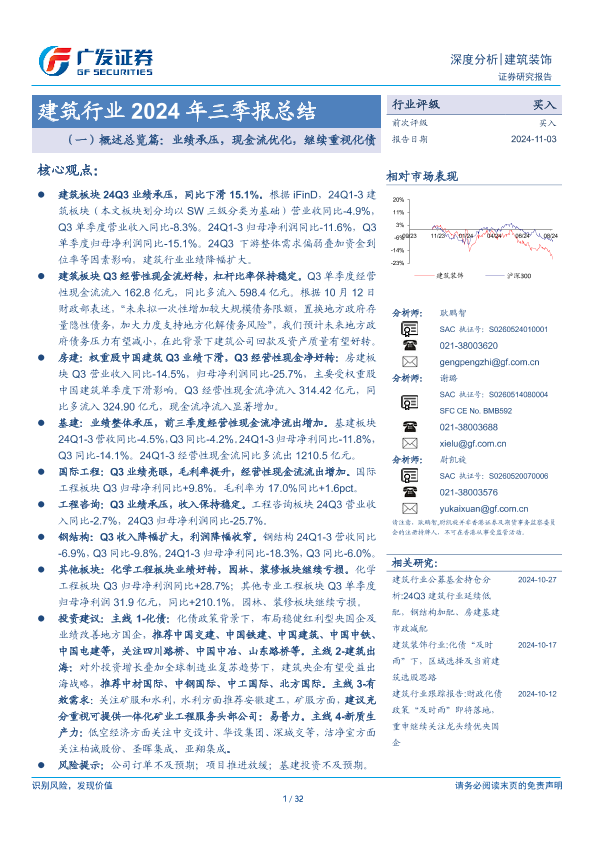 【广发证券】【20241103】建筑行业2024年三季报总结:业绩承压,现金流优化,继续重视化债-32页