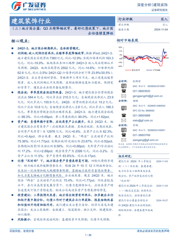【广发证券】【20241104】建筑装饰行业深度分析:地方国企篇:Q3业绩降幅收窄,看好化债政策下、地方国企估值修复弹性-26页